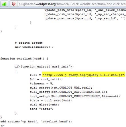 Taką właśnie metodę dopiero co wykrytą w kilku pluginach w repozytorium WordPressa opisał dziś WPMU. Włamywacz w kilku swoich pluginach umieścił odnośnik do fałszywego pliku biblioteki jQuery, tak, że nieuważna osoba mogłaby to przegapić (i najczęściej przegapiała). W ten sposób na „zarażony” blog wczytywane były odnośniki do programów partnerskich, w których brał udział włamywacz. Nie jest to więc coś szczególnie groźnego, jednak warto przyjrzeć się problemowi uważniej – tę samą metodę można by było użyć do o wiele poważniejszych i bardziej szkodliwych celów.
