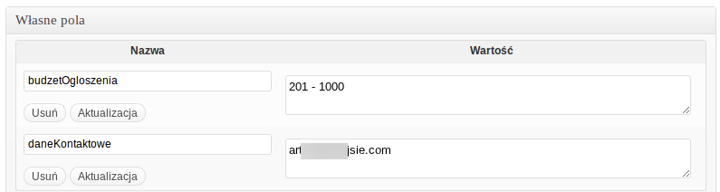 To są właśnie metadane: zawierają jakąś nazwę – nazwą metadanej budżetu jest budzetOgloszenia a jego wartością liczba przesłana przez formularz.