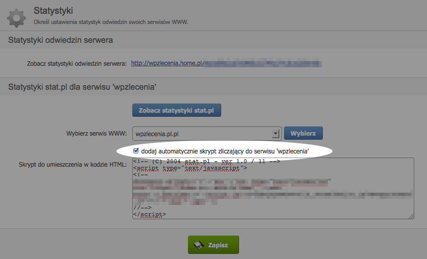 „dodaj automatycznie skrypt zliczający do serwisu”