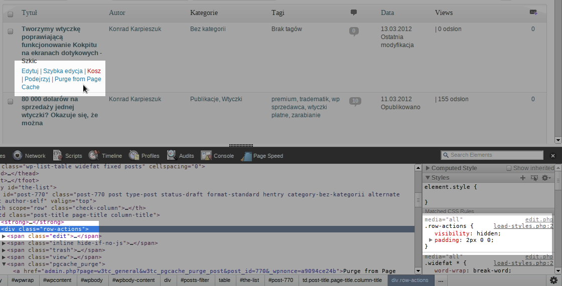 Jak widać każdy blok w takimi szybkimi linkami ma przypisaną klasę row_actions a w niej zdefiniowane visibility: hidden. Musimy zmienić wartość tego parametru na visible, kod naszego pliku style.css będzie więcej krótki: