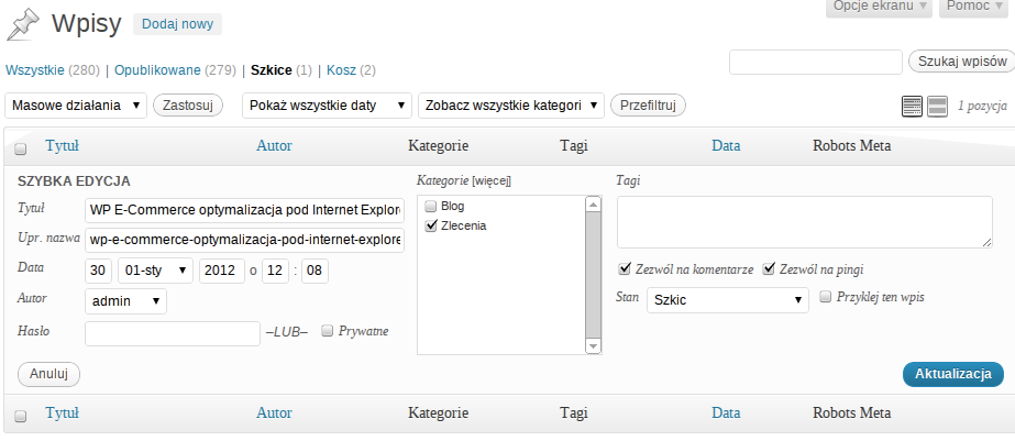 Powyższy widok jest chyba wszystkim wordpressowcom znany: po najechaniu myszką na listę wpisów przy każdym z nich pojawia się zestaw kilku linków. Gdy klikniemy w jeden z nich – Szybka edycja – widzimy to co powyżej.
